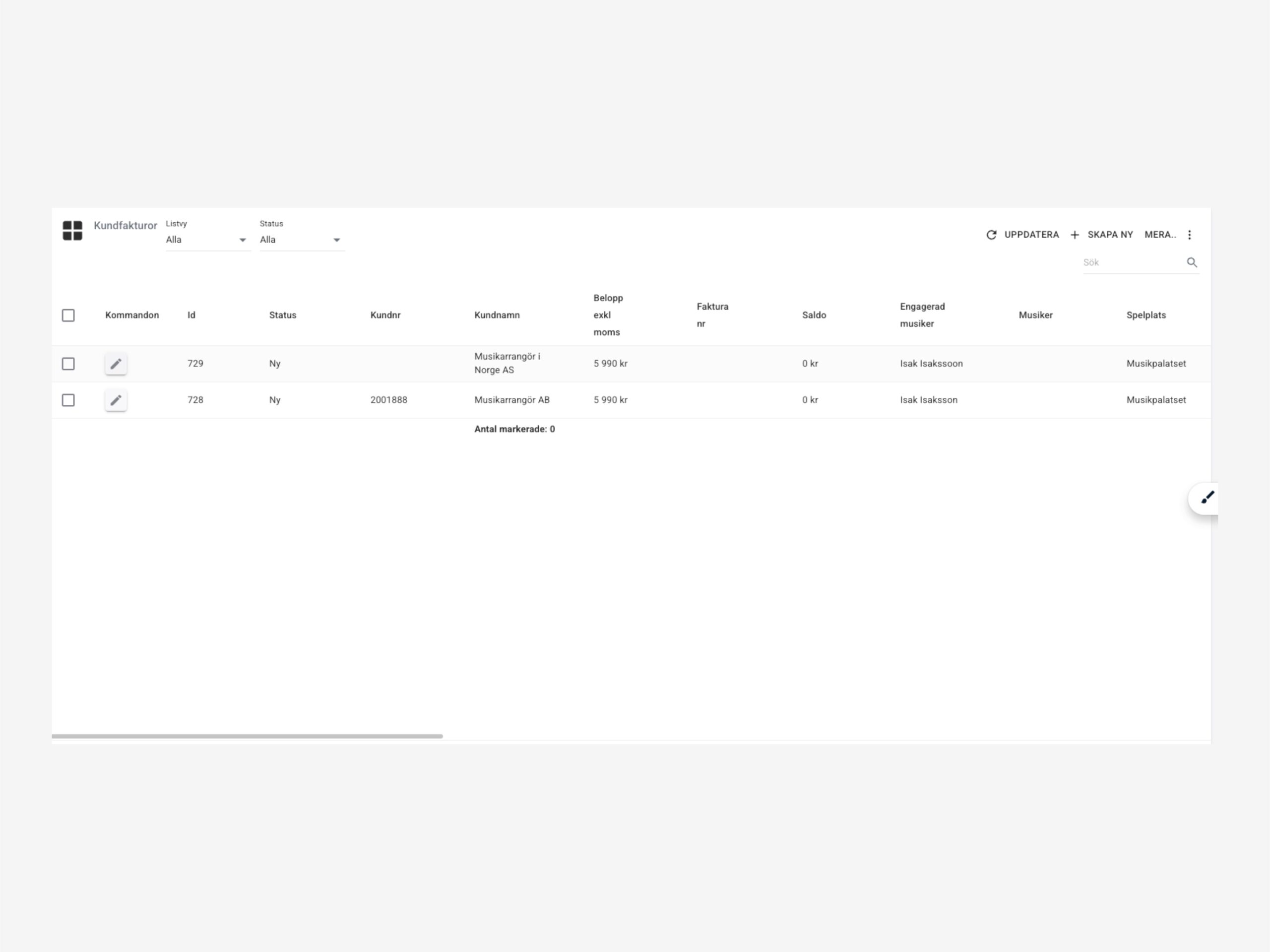 Meny: Kundfakturor – se skickad, betald och lönehanterad faktura.