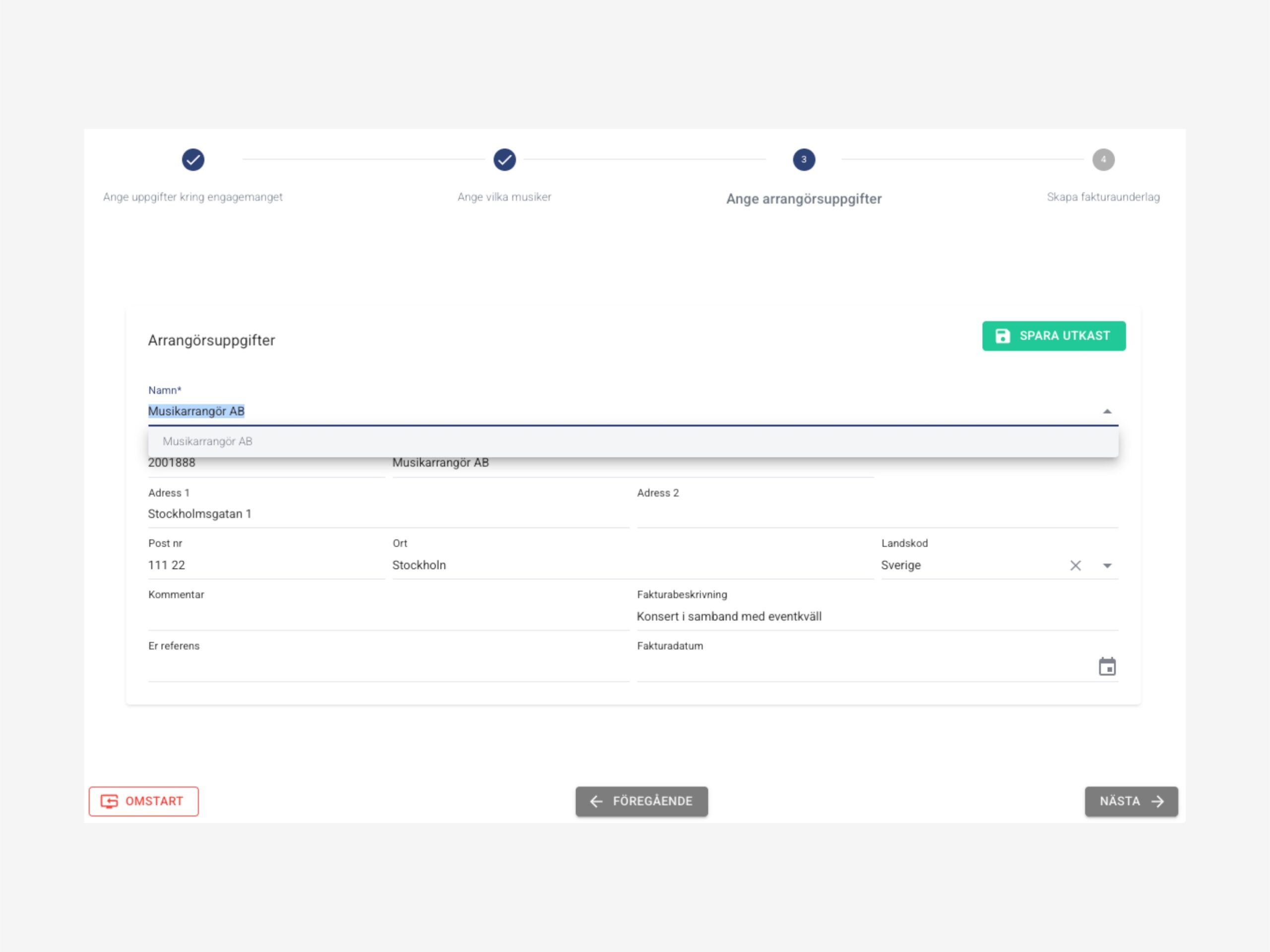3. Lägg till arrangör. Om det är en återkommande arrangör finns den sparad i menyn på första raden. Om det är en ny arrangör, fyll i uppgifter från rad två, dessa sparas automatiskt för framtiden.